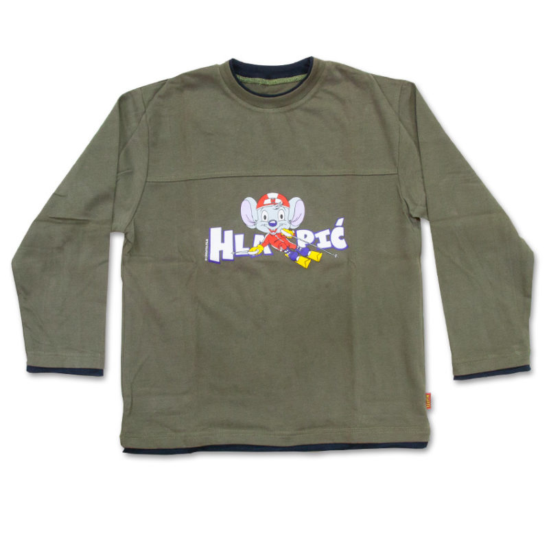 Topla i meka majica maslinastozelene boje s motivom Hlapića na skijama, izrađena je od finog brušenog pamučnog materijala. Sirovinski sastav: 100% pamuk