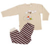 Pidžama s motivom Hlapića koji spava i sanja ovčice. Gornji dio je jednobojni bež, dok je donji dio na smeđe-bež prugice. Sirovinski sastav: 90% pamuk, 10% elastansko vlakno.