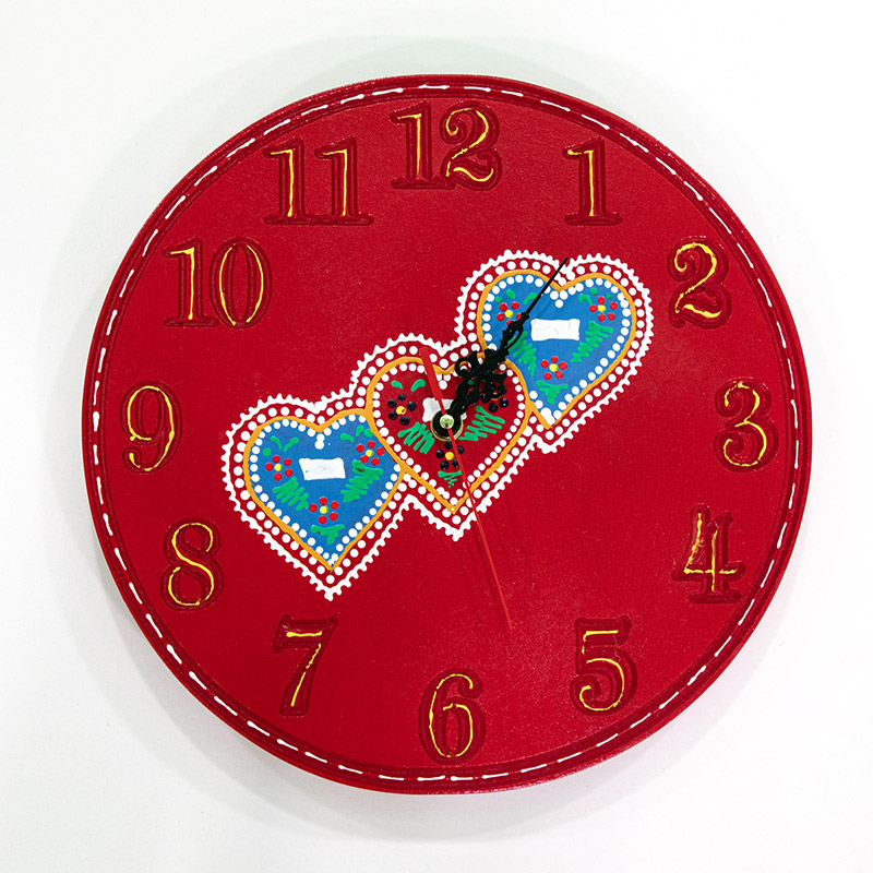 Drveni zidni sat, radi na bateriju, ručno izrađen na način na koji se ukrasi i igračke u Hrvatskom zagorju izrađuju još od 19. stoljeća. Sat je ručno obojen i bogato ukrašen.